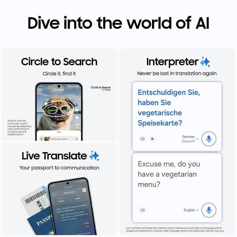LEGAL: Galaxy AI features by Samsung will be provided for free until the end of 2025 on supported Samsung Galaxy devices. Requires Samsung account login and internet connection. Instant Slow-Mo available only with videos saved in the Samsung Gallery app, recorded at up to 4K@60fps (not available with HDR10+ videos). Products sold separately. Live Translate: Requires compatible Galaxy device. Samsung account login and language preset (English and Spanish pre-installed; other languages require free download). Results may vary. Charger not included. Use only Samsung-approved chargers and cables. Do not use worn or damaged chargers or cables. An incompatible charger or cable can cause damage to your device and/or serious injuries. Based on average battery life under typical usage conditions. Average expected performance based on typical use. Actual battery life depends on factors such as network, features selected, frequency of calls, and voice, data, and other application usage patterns. Results may vary.